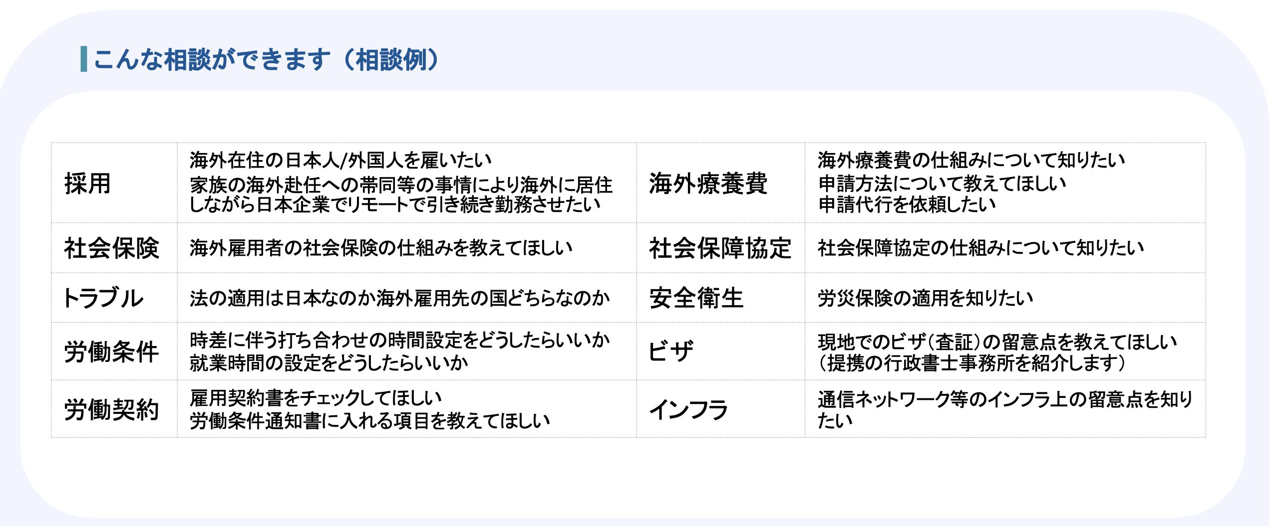 | 1.初回相談(ここまでは契約締結前にご相談可能です) | 1-1. 基本情報の確認 | 越境テレワークの背景、社会保険加入状況、健康保険組合の有無、海外の取得ビザの種類と就労可否などをお伺いします 特に、国によっては就労不可の場合があるため、就労できるビザなのか、または就労資格が取得できそうかご相談前に調べておくことをおすすめします |